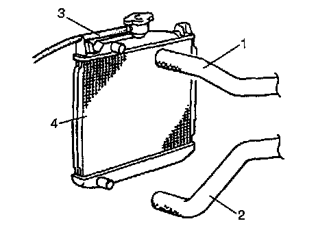 9. Disconnect water hoses (inlet hose (1), outlet hose (2) and reservoir hose (3) from radiator (4).