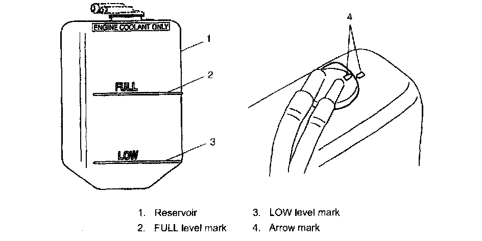 8. Add 50/50 mixture of good quality ethylene glycol antifreeze and water to radiator and tank. Fill radiator to the base of radiator filler neck and reservoir to "FULL" level mark. Reinstall reservoir cap, aligning the arrow marks on the reservoir and cap.