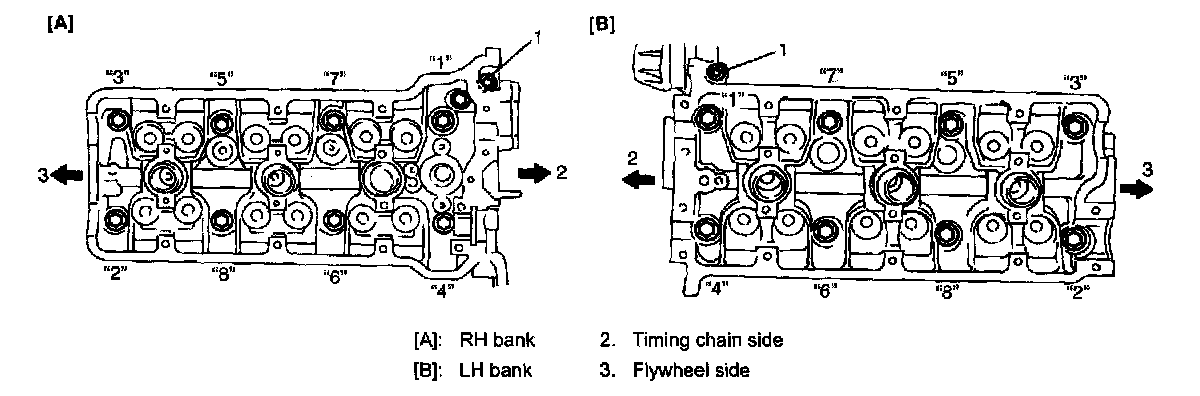 8. Loosen cylinder head bolts in such order ("1" - "8") as shown in the figure and remove them.