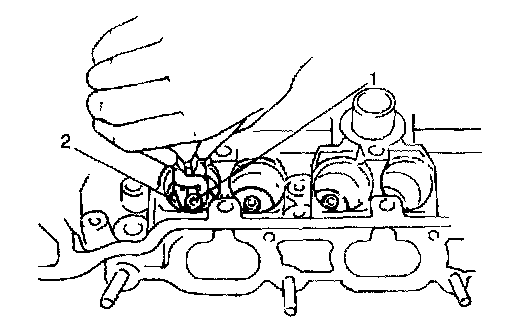 4. Remove valve stem seal (1) from valve guide, and then valve spring seat (2).