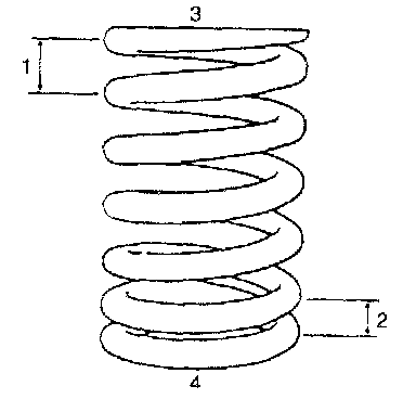 Each valve spring has top end (large-pitch end (1) and bottom end (small-pitch end (2). Be sure to position spring in place with its bottom end (valve spring retainer side (3) facing the bottom (valve spring seat side (4).