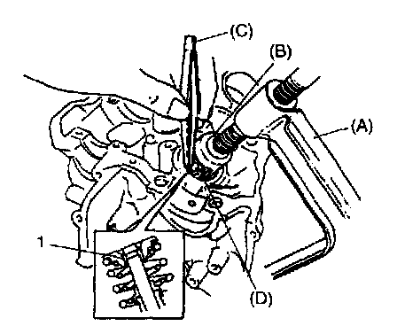 1. Using special tools (A), (B) and (C), compress valve springs and then remove valve coffers (1) by using special (D)