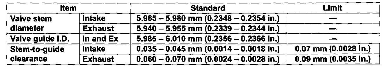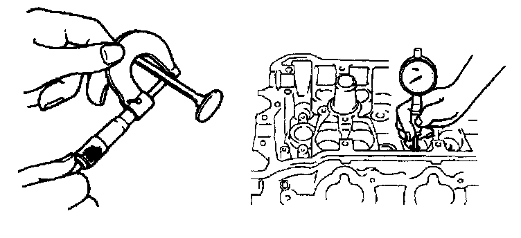 Using a micrometer and bore gauge, take diameter readings on valve stems and guides to check stem-to-guide clearance. Be sure to take reading at more than one place along the length of each stem and guide. If clearance exceeds limit, replace valve and valve guide.