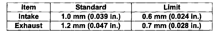Intake and Exhaust: 1.1 - 1.3 mm (0.0433 - 0.0512 inch)