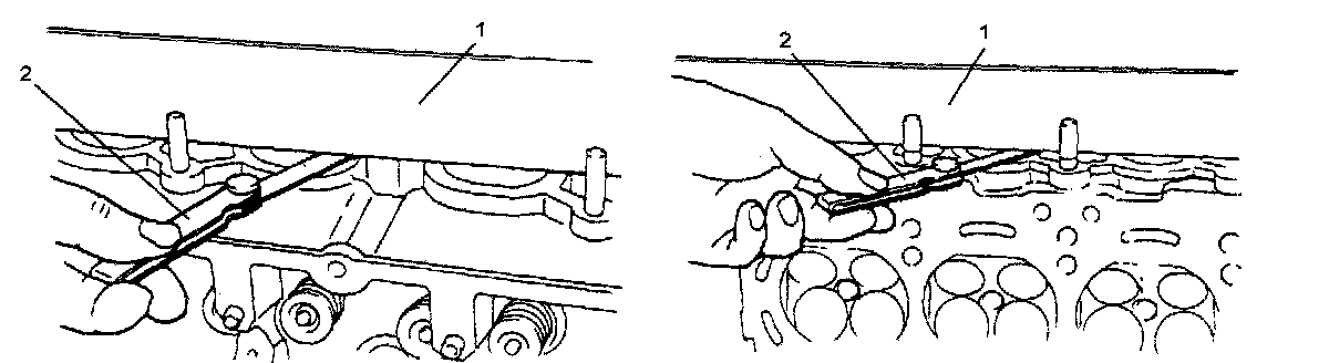 Check seating faces of cylinder head for manifolds, using a straightedge (1) and thickness gauge (2), in order to determine whether these faces should be corrected or cylinder head replaced.