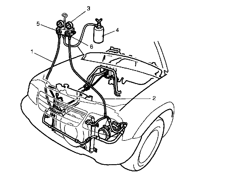 6. Charge A/C system with refrigerant in vapor state. At this time, refrigerant container should be held upright.