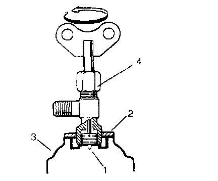 i. Retract needle (1) and remove refrigerant container tap valve (4) by loosening its plate nut (2).