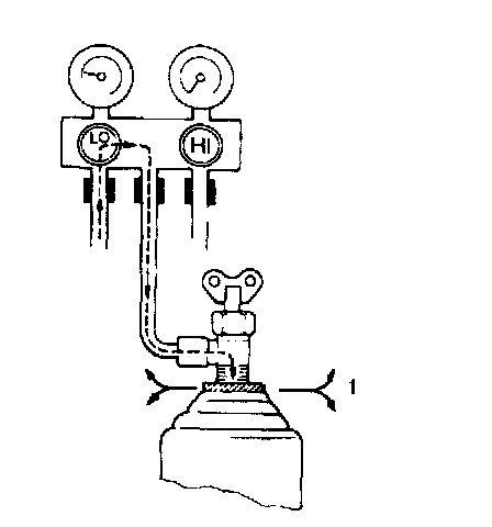 iii. As soon as refrigerant comes out with a "hiss" (1) through a clearance between refrigerant container and tap valve, tighten plate nut as well as manifold gauge set low pressure valve.