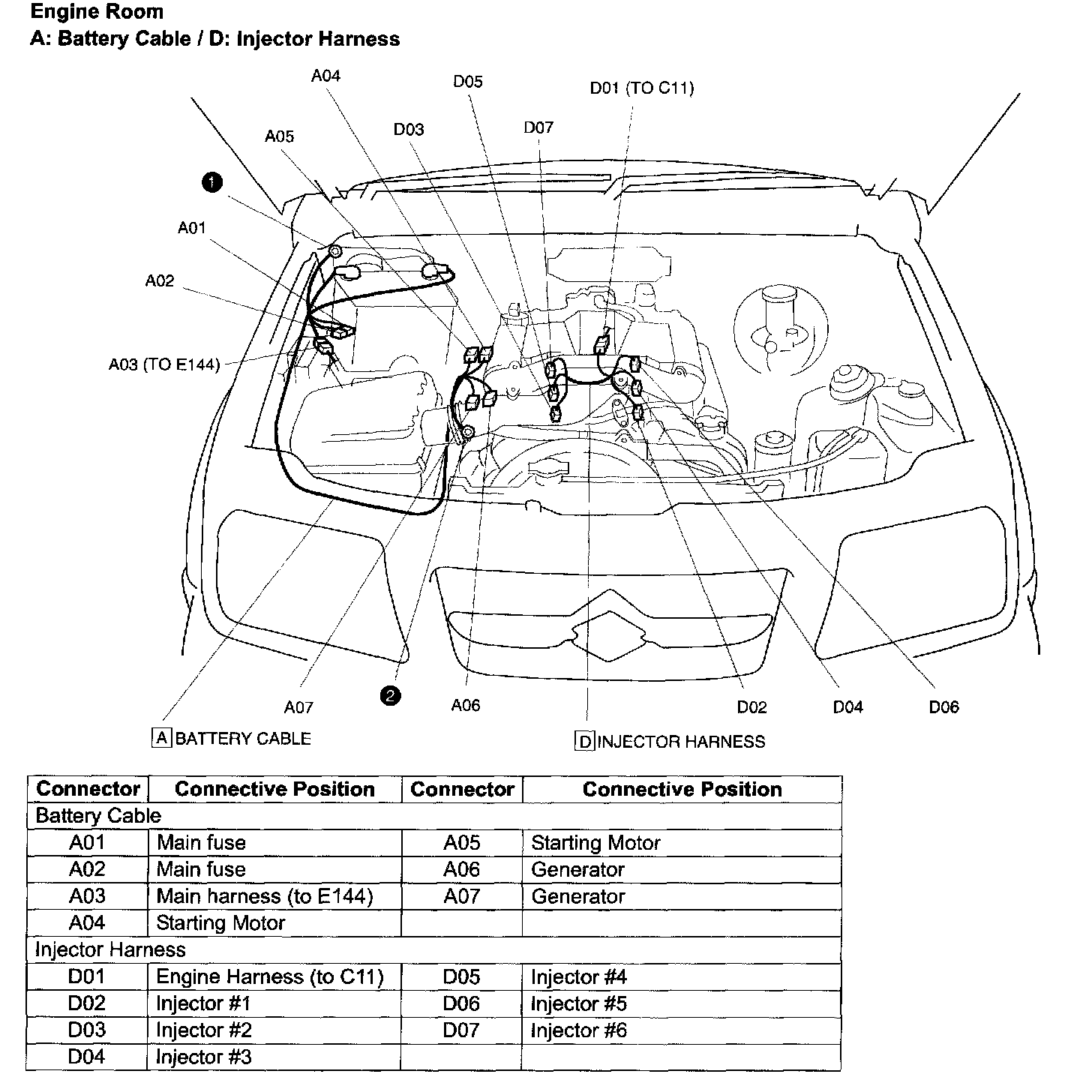 A: Battery Cable / D: Injector Harness - Connective Position: