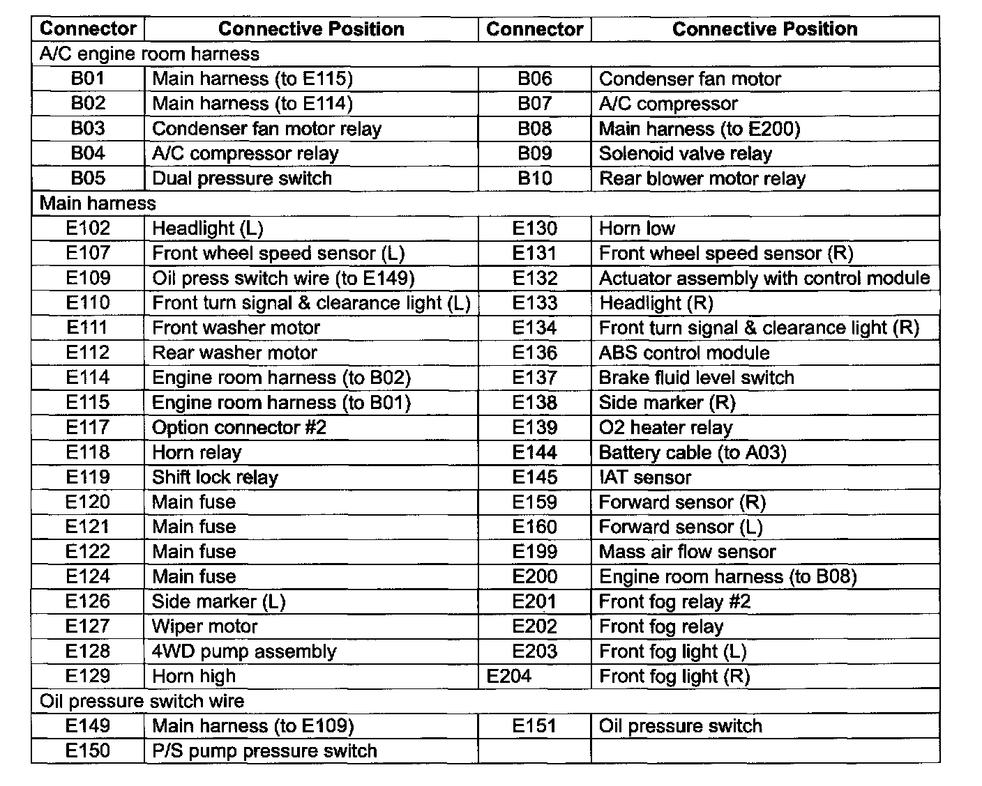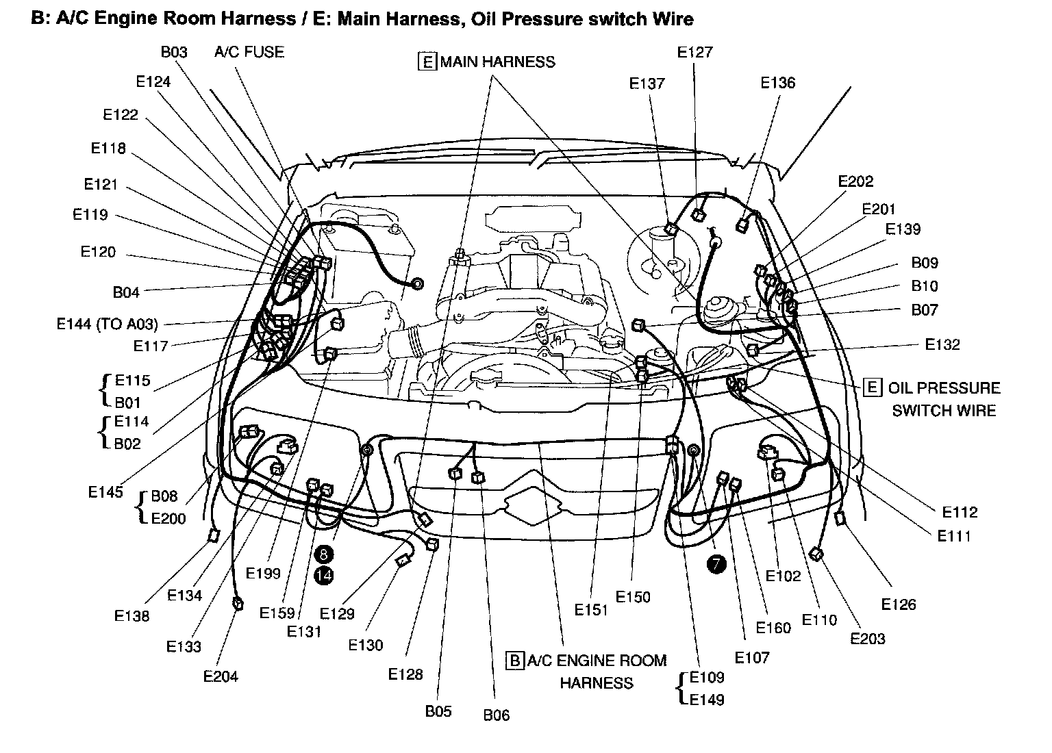 B: A/C Engine Room / E: Main Harness, Oil Pressure Switch Wire (Connector Index) - Connective Position: