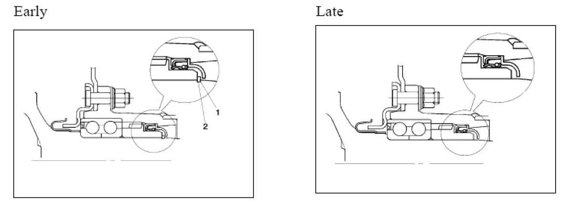 The circlip (1) and circlip groove (2) in the axle have been discontinued on vehicles and spare parts produced starting July 2004.