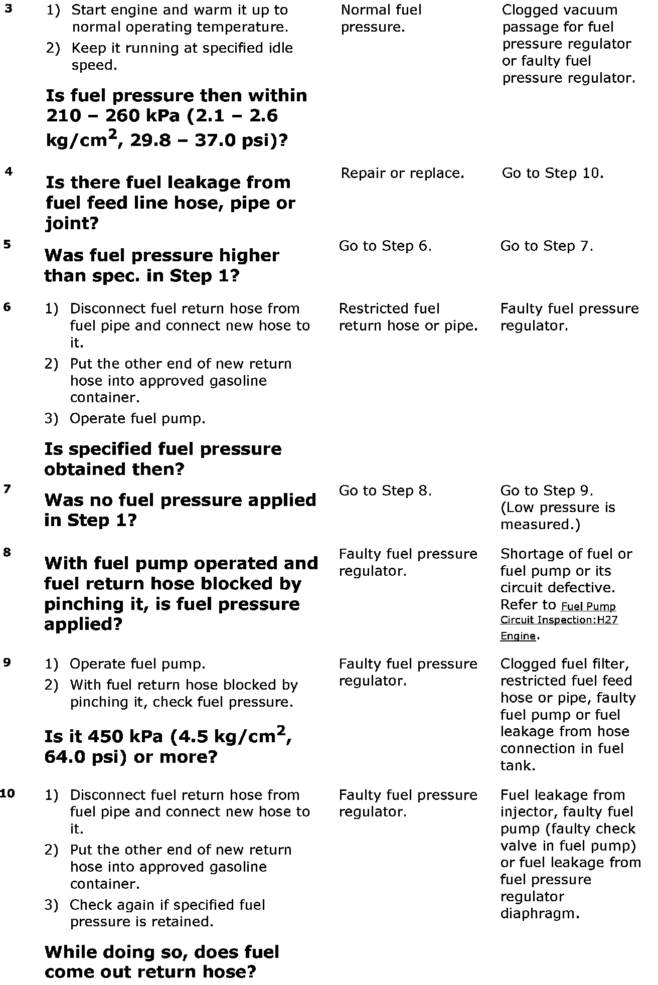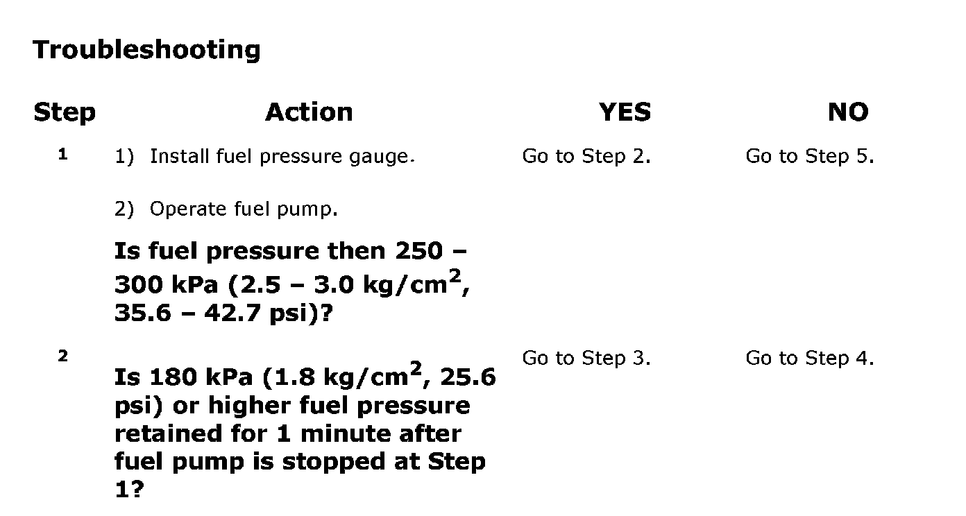 NOTE: Before using the following flow, check to make sure that battery voltage is higher than 11 V. If battery voltage is low, pressure becomes lower than specification even if fuel pump and line are in good condition.