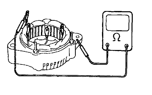 - Using ohmmeter, check that there is no continuity between coil leads and stator core. If there is continuity, replace stator.
