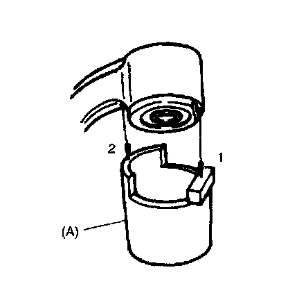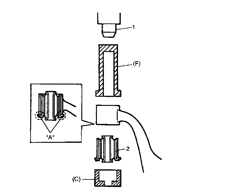 1. Press-fit front bushing (2) until its flange contacts housing edge (A) of control arm, use special tools and hydraulic press (1) as shown in the figure.