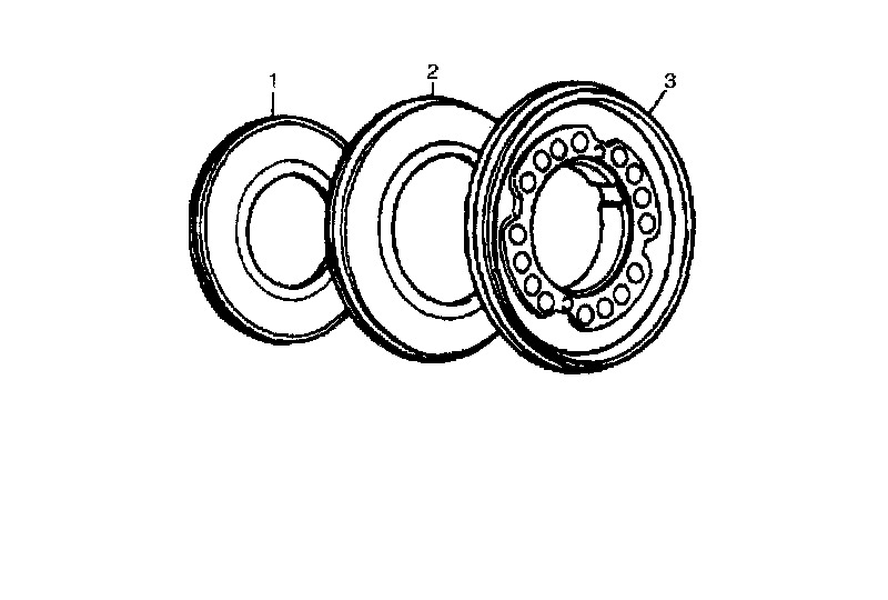 13. Apply grease to forward clutch rear No. 1 race (1), thrust rear bearing (2), thrust bearing rear planetary ring race (3) and install thrust bearing planetary ring race (3) to direct clutch cylinder and forward clutch rear No. 1 race and thrust bearing to forward clutch hub.