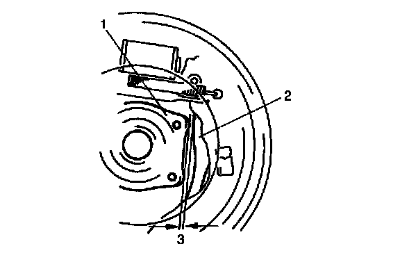6. Check to ensure that there is clearance between rear wheel bearing retainer (1) and parking brake shoe lever (2). If no clearance (3) is found, loosen cable locking nut further to obtain clearance.