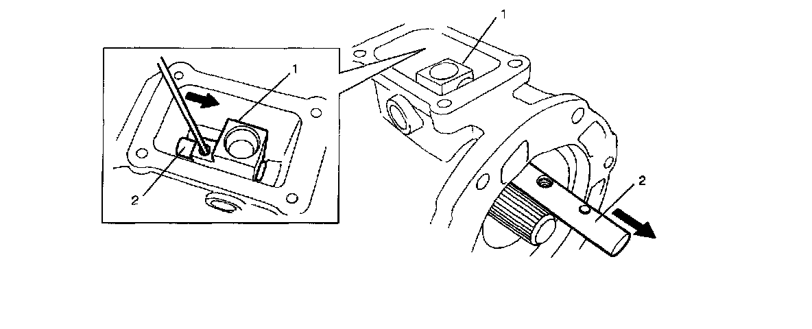 25. Remove low gear shift shaft (2)and locating roller No. 1 (1).