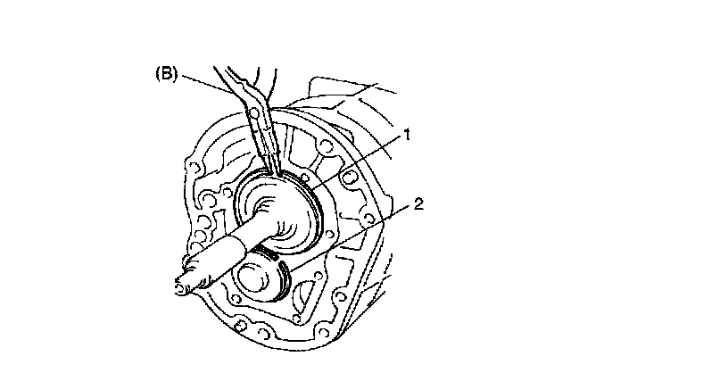 7. After removing transmission case bolts/nut, remove transmission rear case (1) from intermediate case (2).