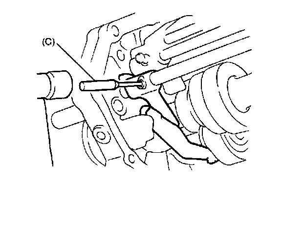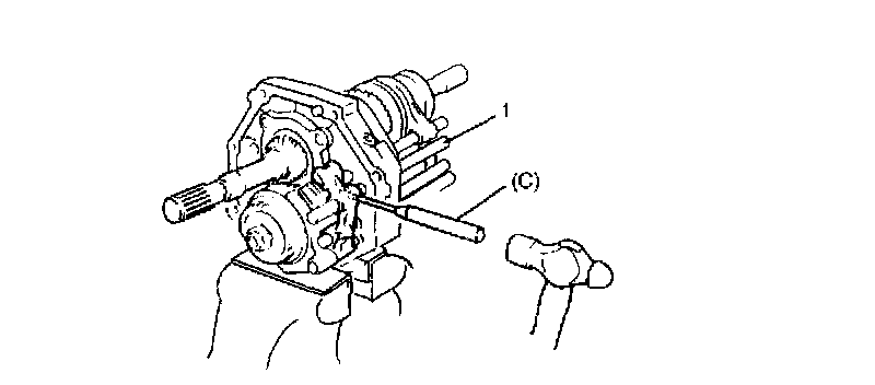 14. Using special tool (C), remove spring pin and then remove 5th-reverse gear shift shaft (1).