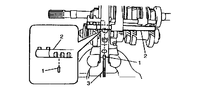 22. Remove locating roller No. 2 (1) from low gear shift shaft (2) by using magnet (3).