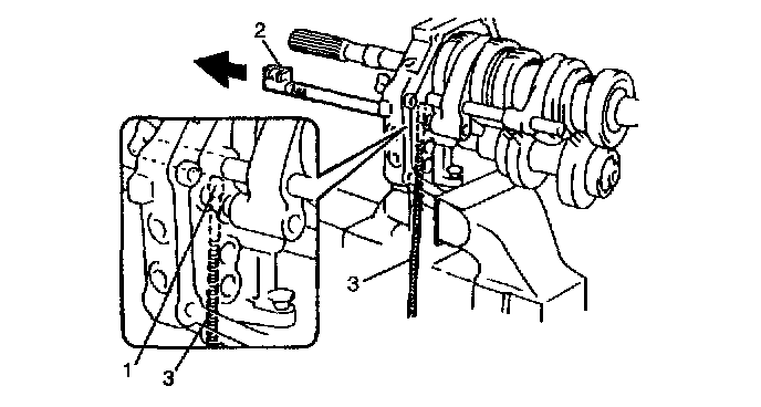 20. Remove reverse gear shift shaft (2), locating roller No. 1 (1), and reverse gear shift link component (3).
