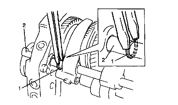 9. Remove C-rings (1) of input shaft bearing and C-ring (2) of counter shaft front bearing.