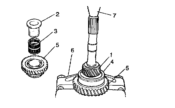2. Pull out 5th gear (1), needle bush (2), needle bearing (3), main shaft bearing (4) and low gear (5) with bearing puller (6) and press (7).