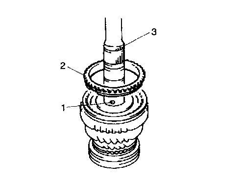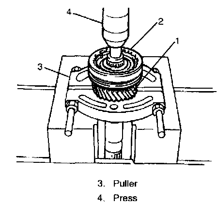 2. Insert 3rd gear (2), needle bearing (3) and high speed sleeve/hub assembly (4) with synchronizer ring to main shaft (1).