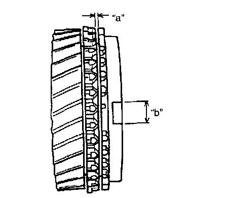 ^ Check clearance "a" between synchronizer ring and gear, key slot width "b" in synchronizer ring and each chamfered tooth of gear and synchronizer ring and replace with new one, if necessary. Also, check gear tooth.