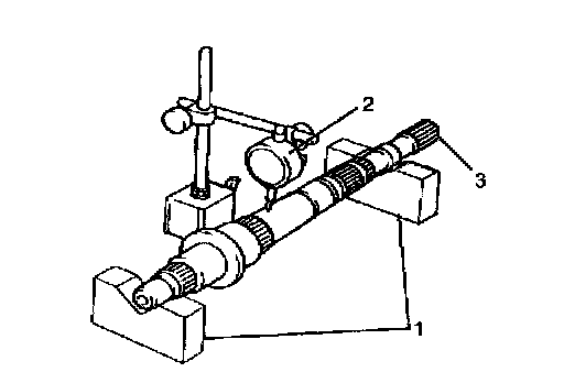 ^ Using "V" blocks (1) and dial gauge (2), check runout. If runout exceeds limit below, replace main shaft (3).