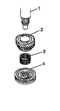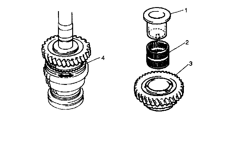 2. Insert 2nd gear (2), needle bearing (3) and low speed sleeve/hub assembly (4) with synchronizer ring to main shaft (1).