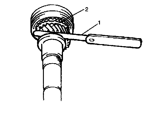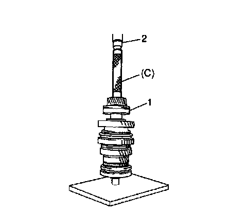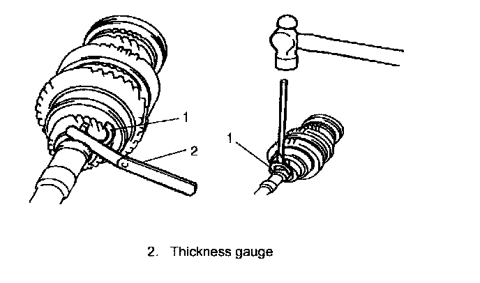 ^ Check low gear (1) thrust clearance by using thickness gauge (2). If clearance is out of specification, repress-fit or replace mainshaft bearing and 5th gear.