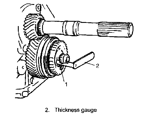 15. Check counter shaft 5th gear (1) thrust clearance by using thickness gauge (2).