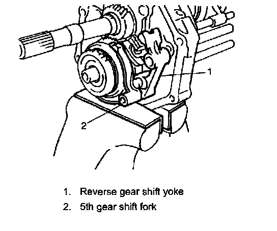29. Install reverse gear shift yoke (1) and 5th gear shift fork (2) as shown in the figure.