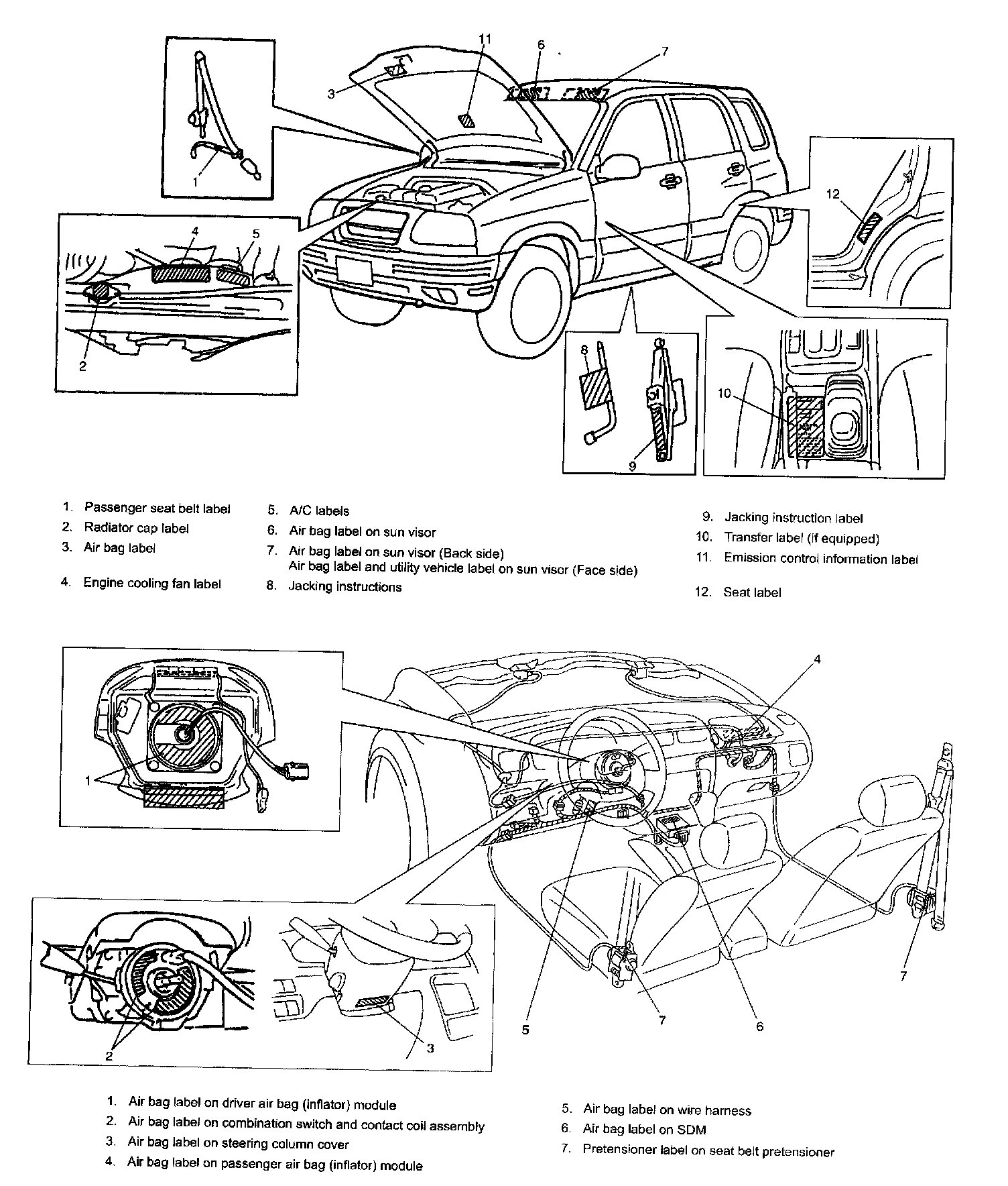 The figure shows main labels among others that are attached to vehicle component parts. When servicing and handling parts, refer to WARNING / CAUTION instructions printed on labels. If any WARNING / CAUTION label is found stained or damaged, clean or replace it as necessary.