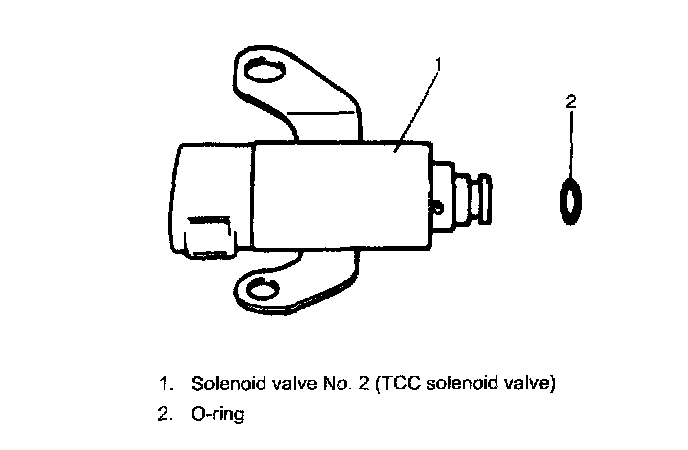 5. Remove TCC (lock-up) solenoid valve (1) and Then remove O-ring (2) from TCC solenoid valve (1).