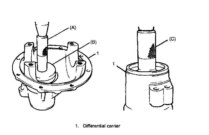 1. Install bevel pinion dummy with bearings into differential carrier and tighten flange nut (1) so that specified bearing preload is obtained.