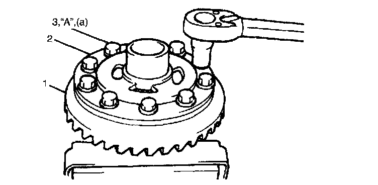 3. Put bevel gear (1) on differential case (2) and fasten them with 10 bolts (3) by tightening them to specified torque. Use thread lock cement for 10 bolts (3).