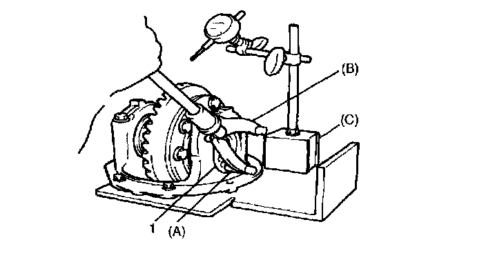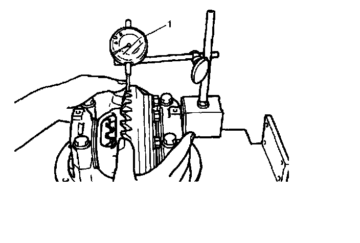 ^ Be sure to apply measuring tip of dial gauge (1) at right angles to convex side of tooth.