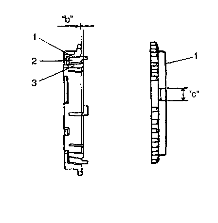 ^ Put the synchronizer outer ring (1), inner ring (3) and the cone (2) together and then measure the step difference between the outer ring (1) and the inner ring (3). And also check key slot width "c" in synchronizer outer ring (1) and each chamfered tooth of gear and synchronizer ring and replace with new one, if necessary. Also, check gear tooth.