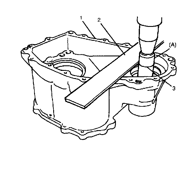 4. Using special tool and press, install needle bearing into rear case (1). As shown in the figure, apply straightedge (2) to case surface and press-fit till top (3) of special tool (A) aligns with bottom surface of straightedge (2) (i.e., case surface).