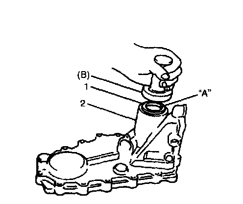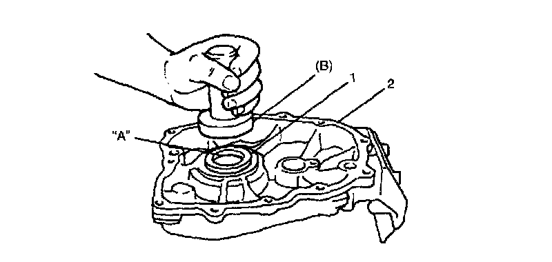 2. Using special tool and hammer, drive oil seal (1) into center case (2) until it becomes flush with case surface. Apply grease "A" to oil seal lip.