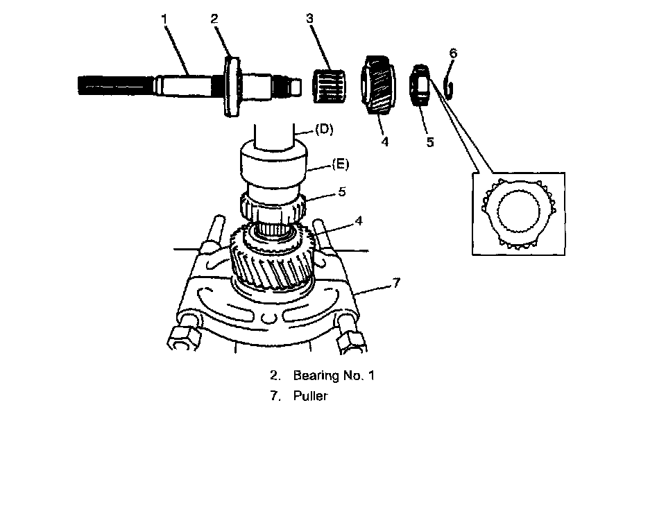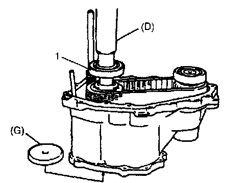 9. Using press and special tools, install bearing No. 1 (1) into output rear shaft (2). Place circlip portion of bearing on top as shown in figure.