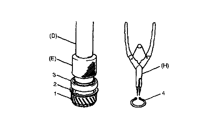 19. After installing large size circlip (4), install speedometer drive gear (3) and secure it with small size circlip (2).