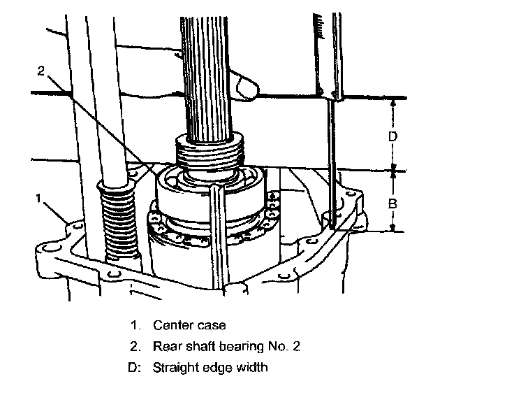 b. Place straightedge on bearing No. 2 (2) securely and measure bearing height "B" (from center case (1) mating surface to No. 2 bearing top).