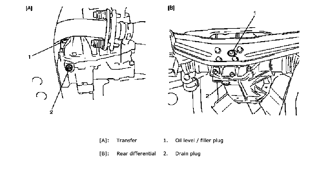 Transfer Oil (4WD A/T) and Rear Differential Oil (4WD) Inspection1. Check transfer case or differential for evidence of oil leakage. Repair leaky point if any.