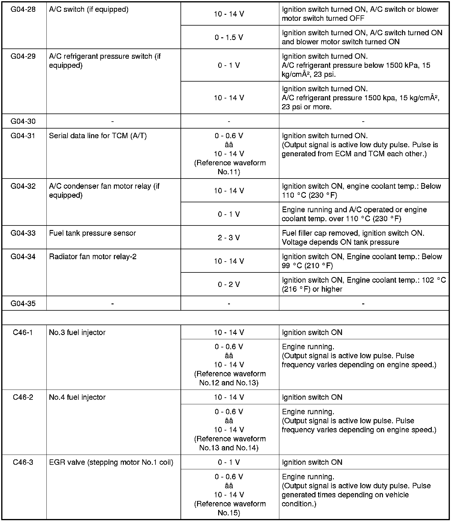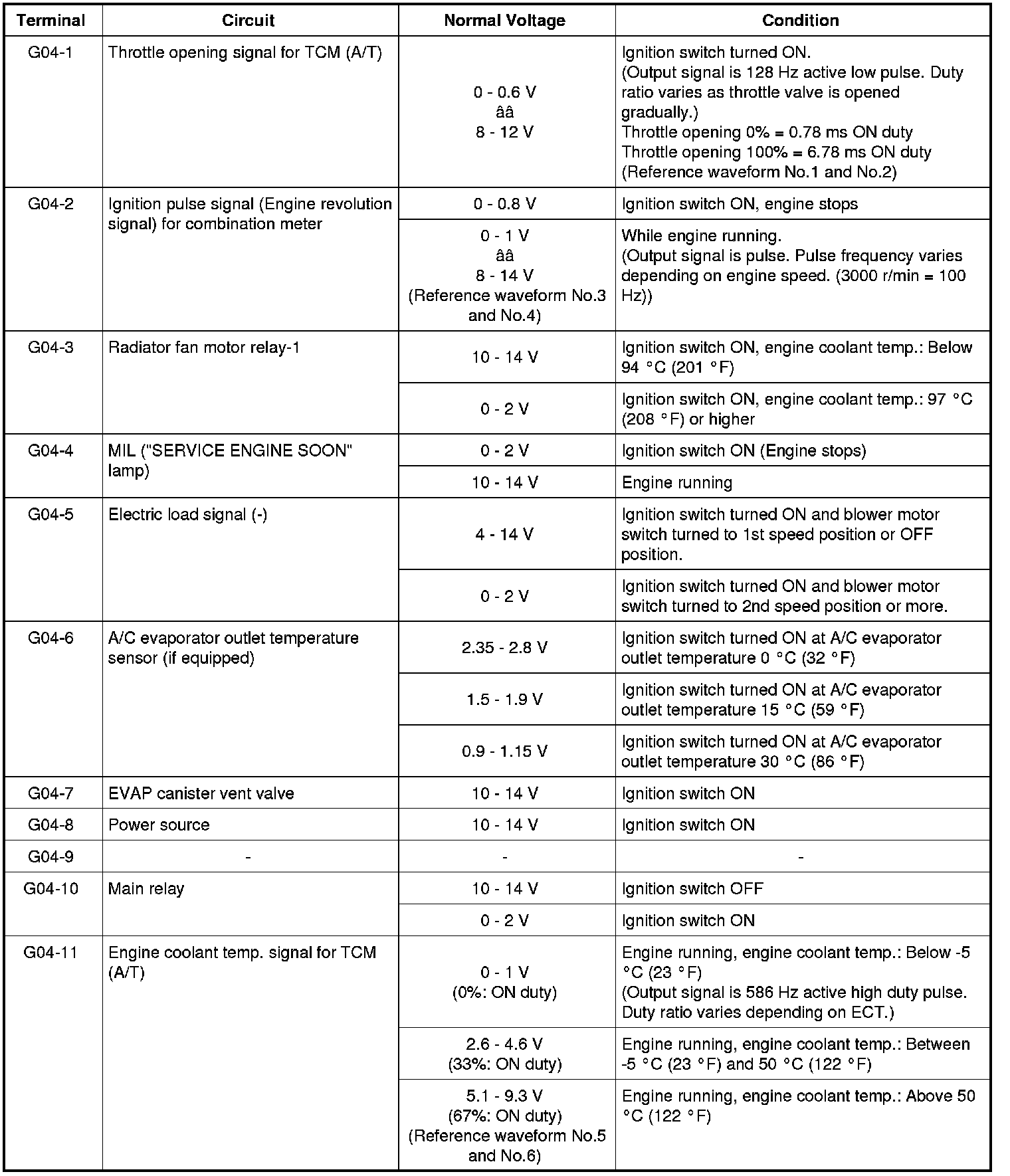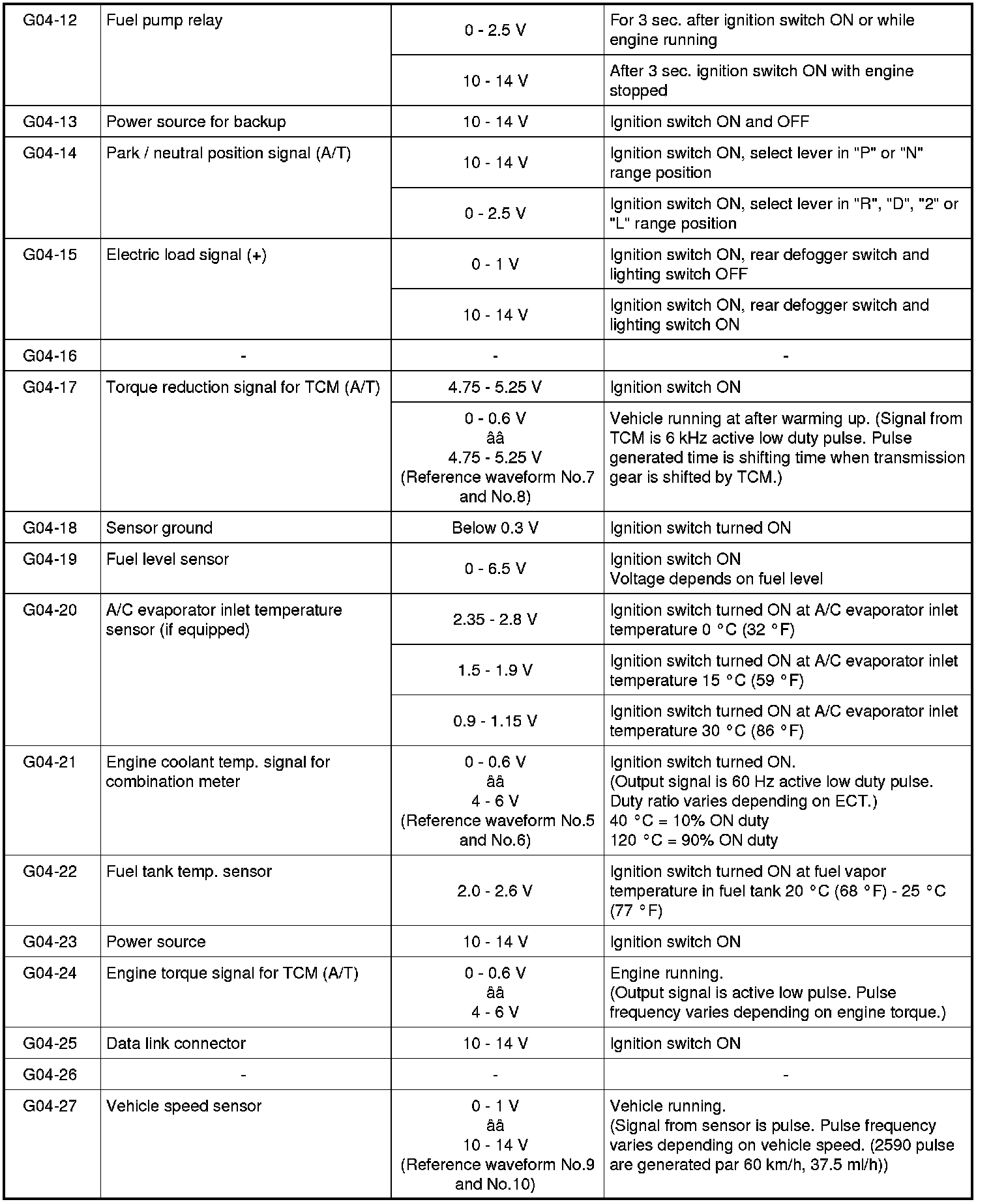 - As each terminal voltage is affected by the battery voltage, confirm that it is 11 V or more when ignition switch is turned ON.