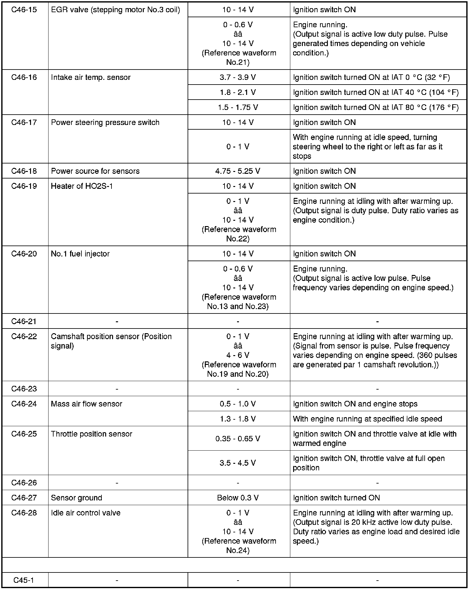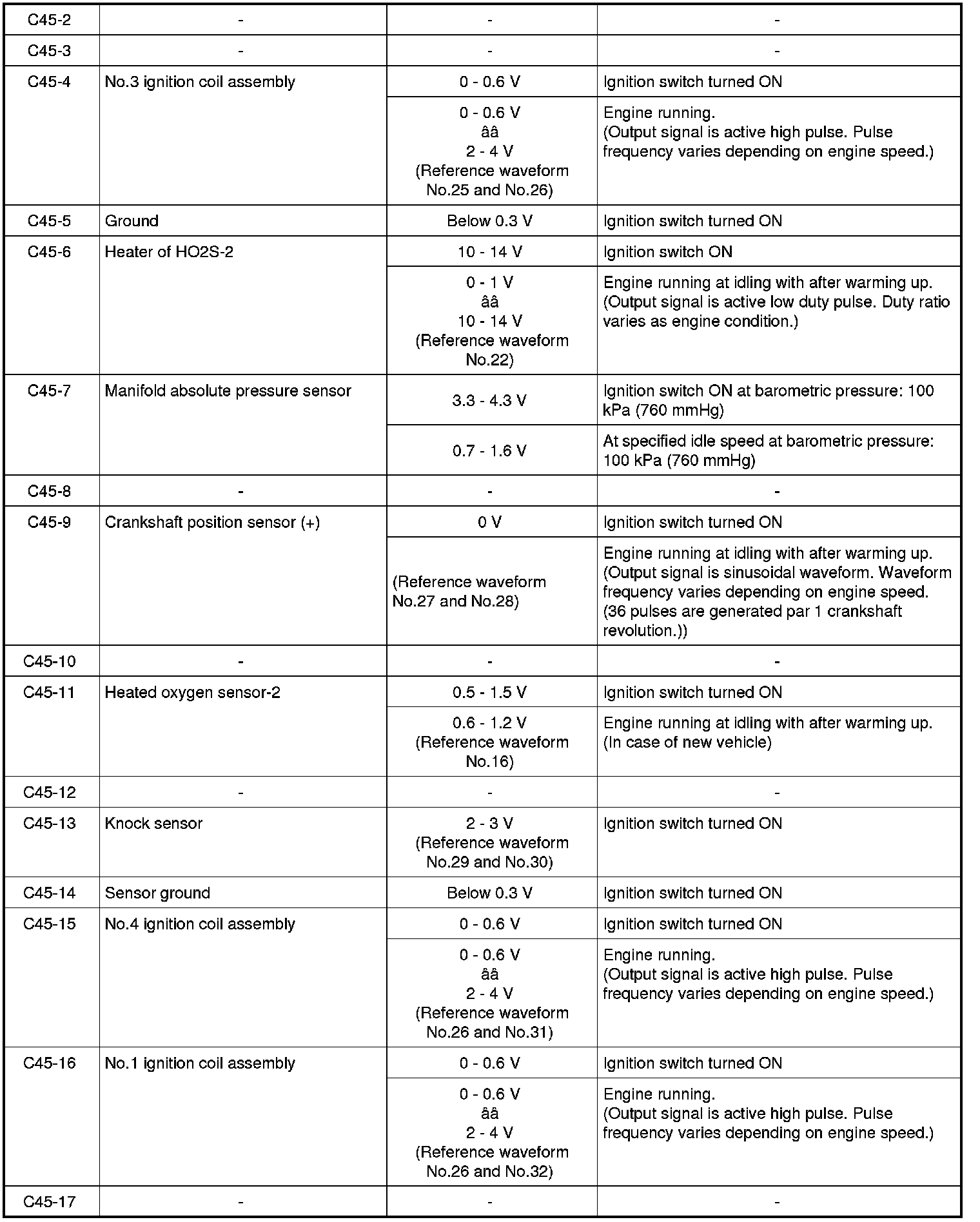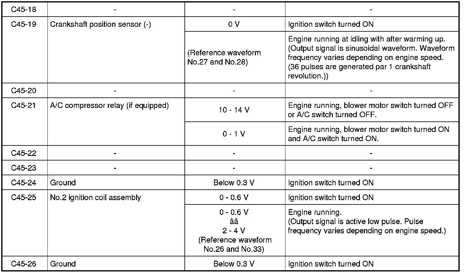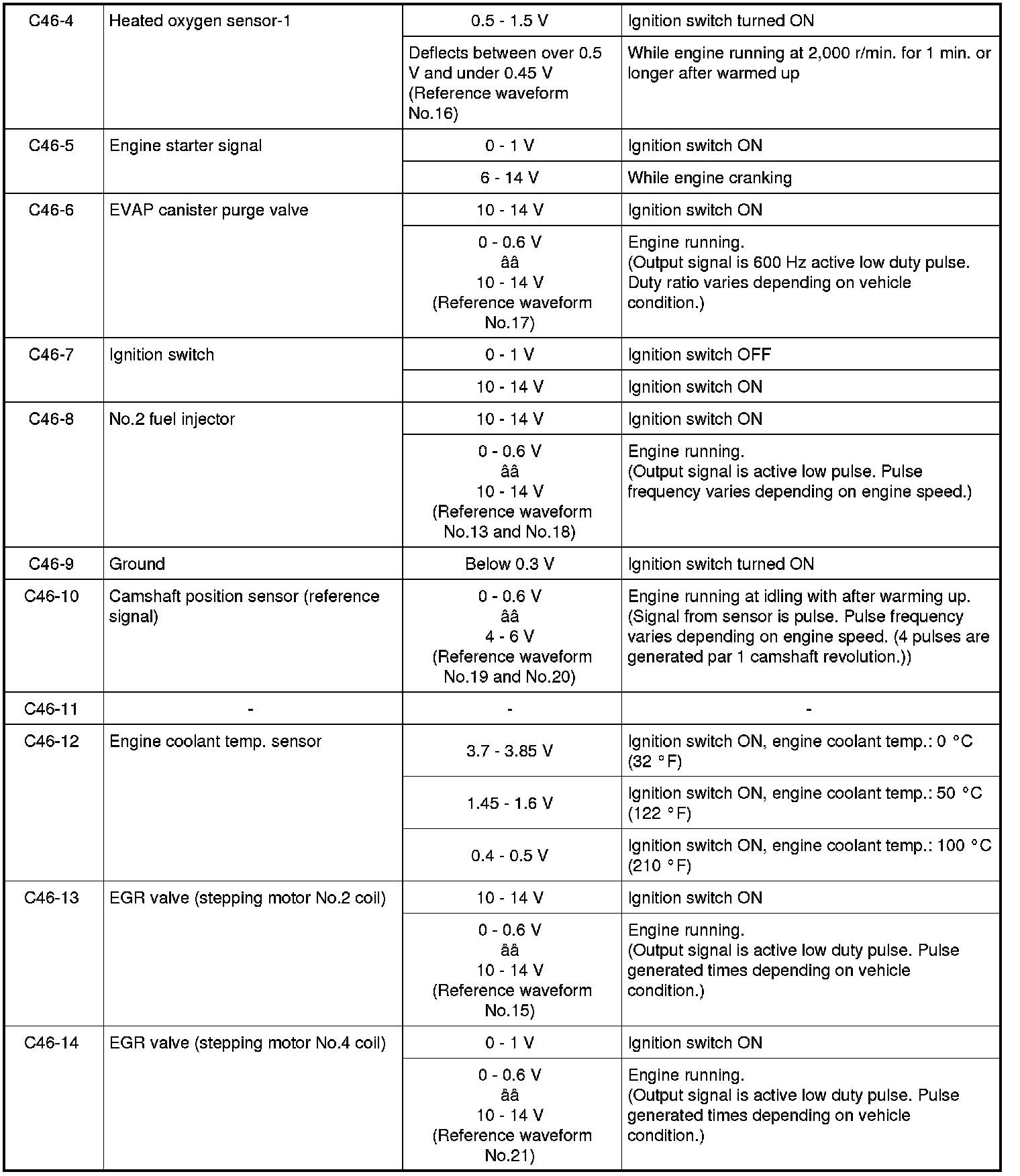 - As each terminal voltage is affected by the battery voltage, confirm that it is 11 V or more when ignition switch is turned ON.
