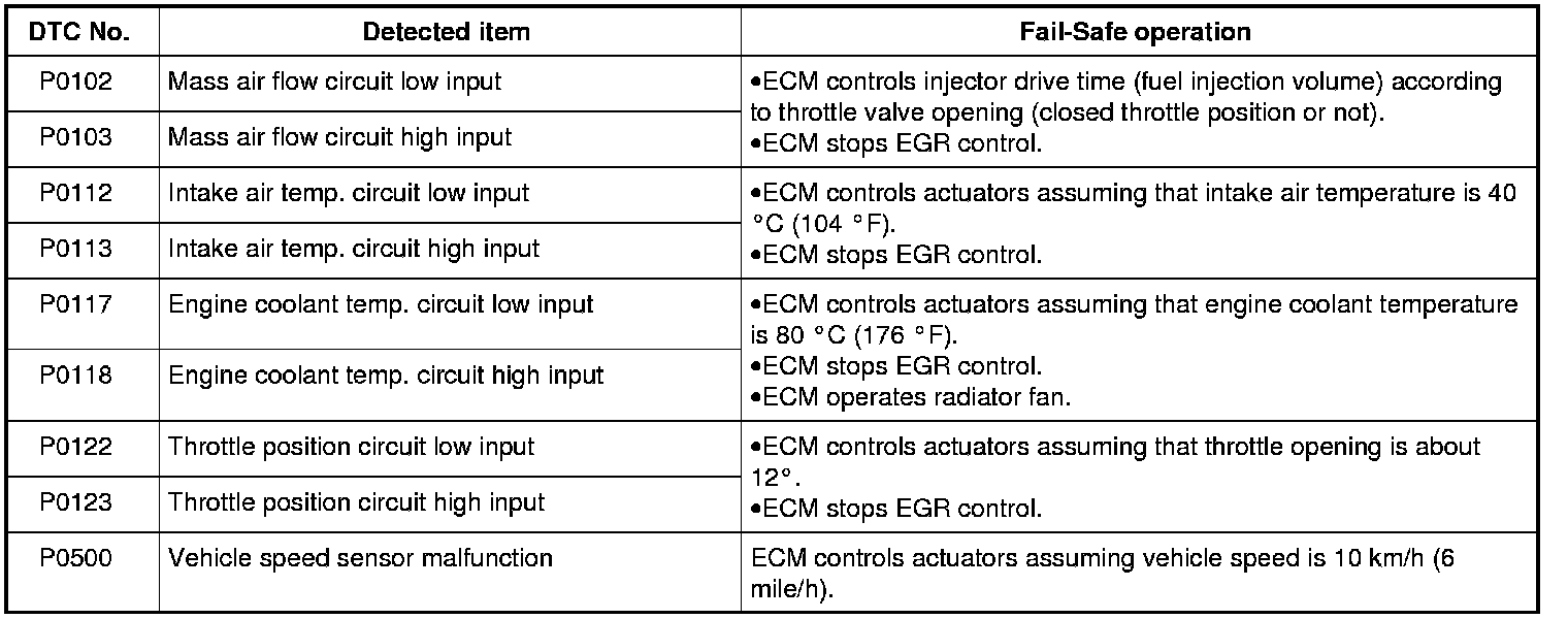When any of the following DTCs is detected, ECM enters fail-safe mode as long as malfunction continues to exist but that mode is canceled when ECM detects normal condition after that.