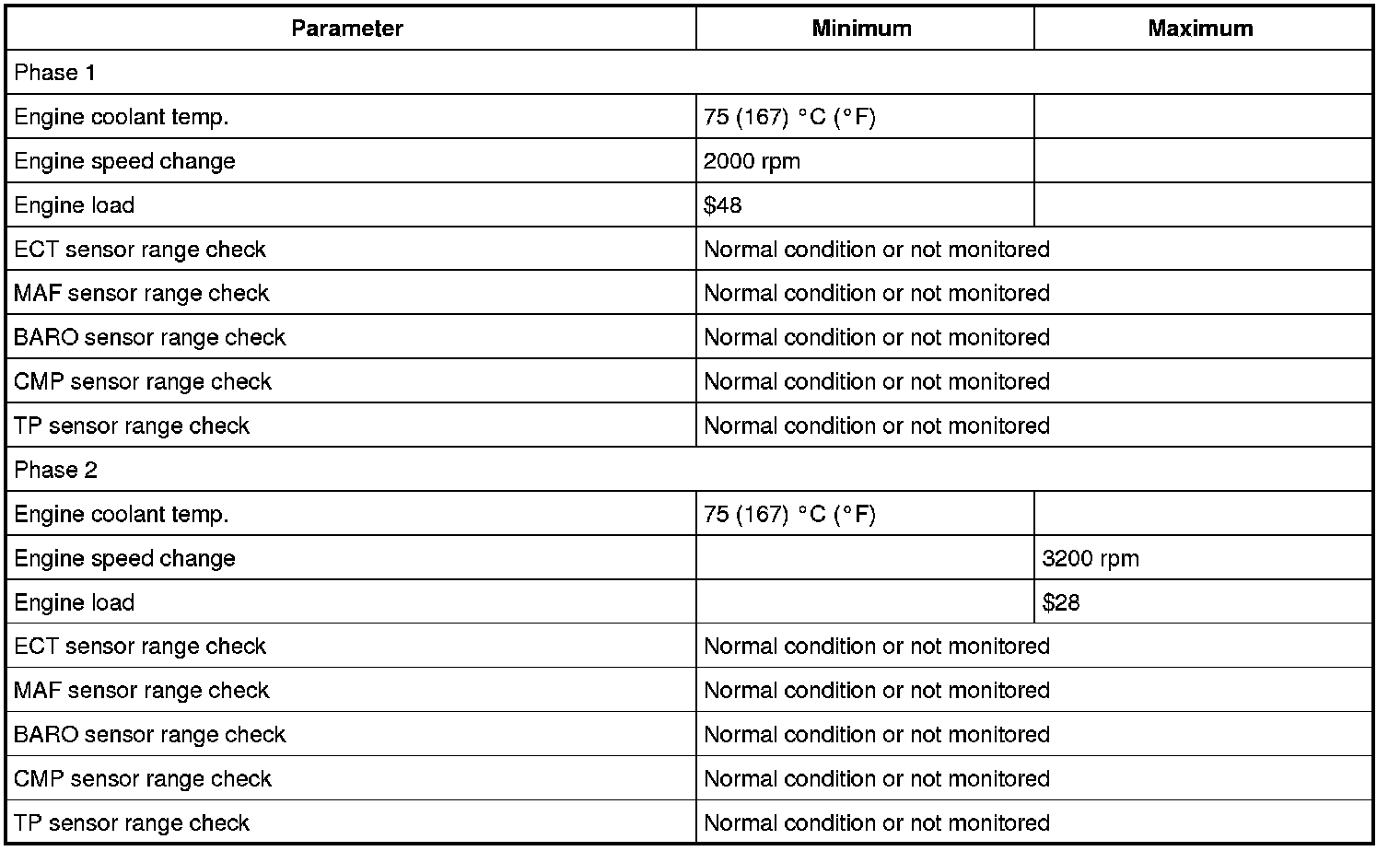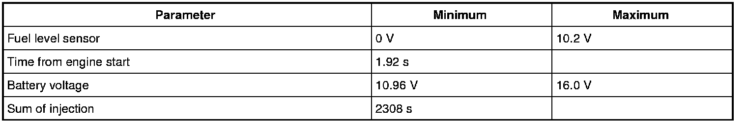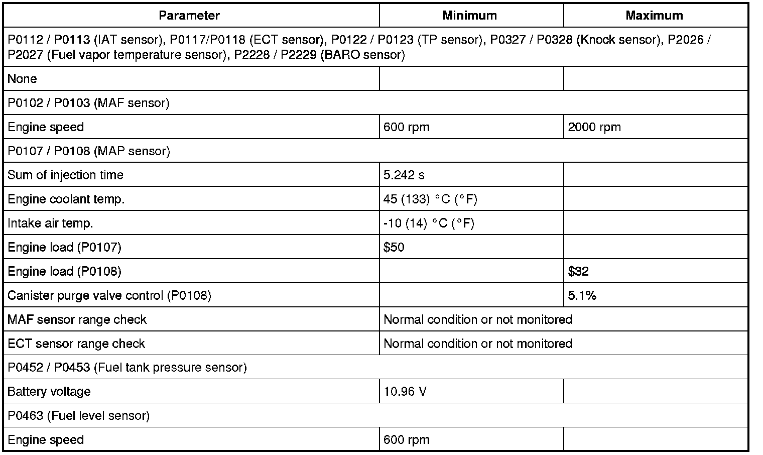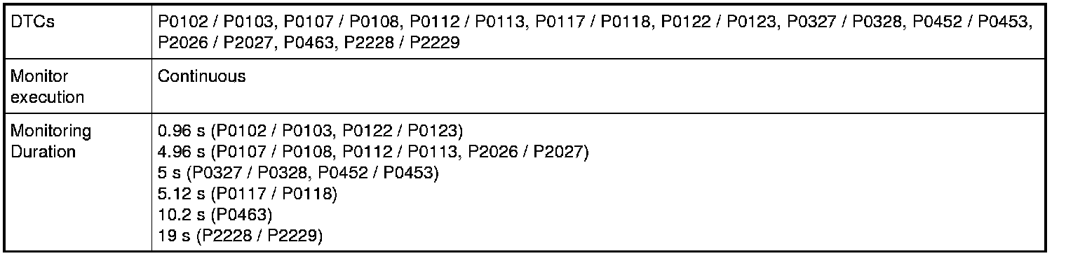 Input signals of MAF (P0102 / P0103), MAP (P0107 / P0108), IAT (P0112 / P0113), ECT (P0117 / P0118), TP (P0122 / P0123), Knock sensor (P0327 / P0328), Fuel tank pressure sensor (P0452 / P0453), Fuel vapor temp. sensor (P2026 / P2027), Fuel level sensor (P0463) and Barometric pressure sensor (P2227 / P2228 / P2229) are checked for open, short of circuit by monitoring input voltage.